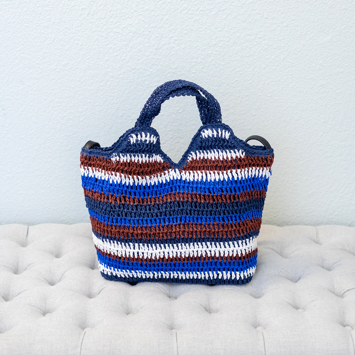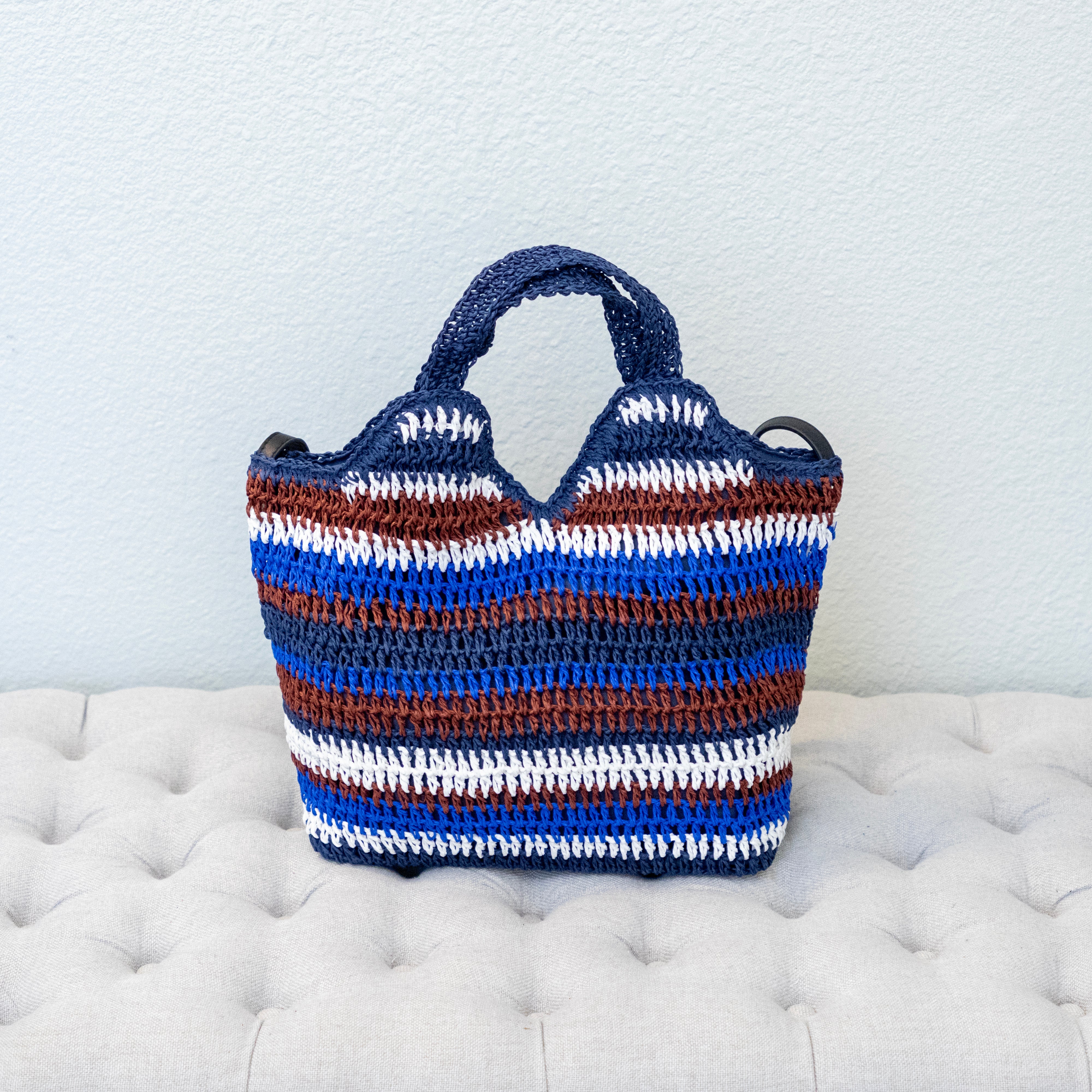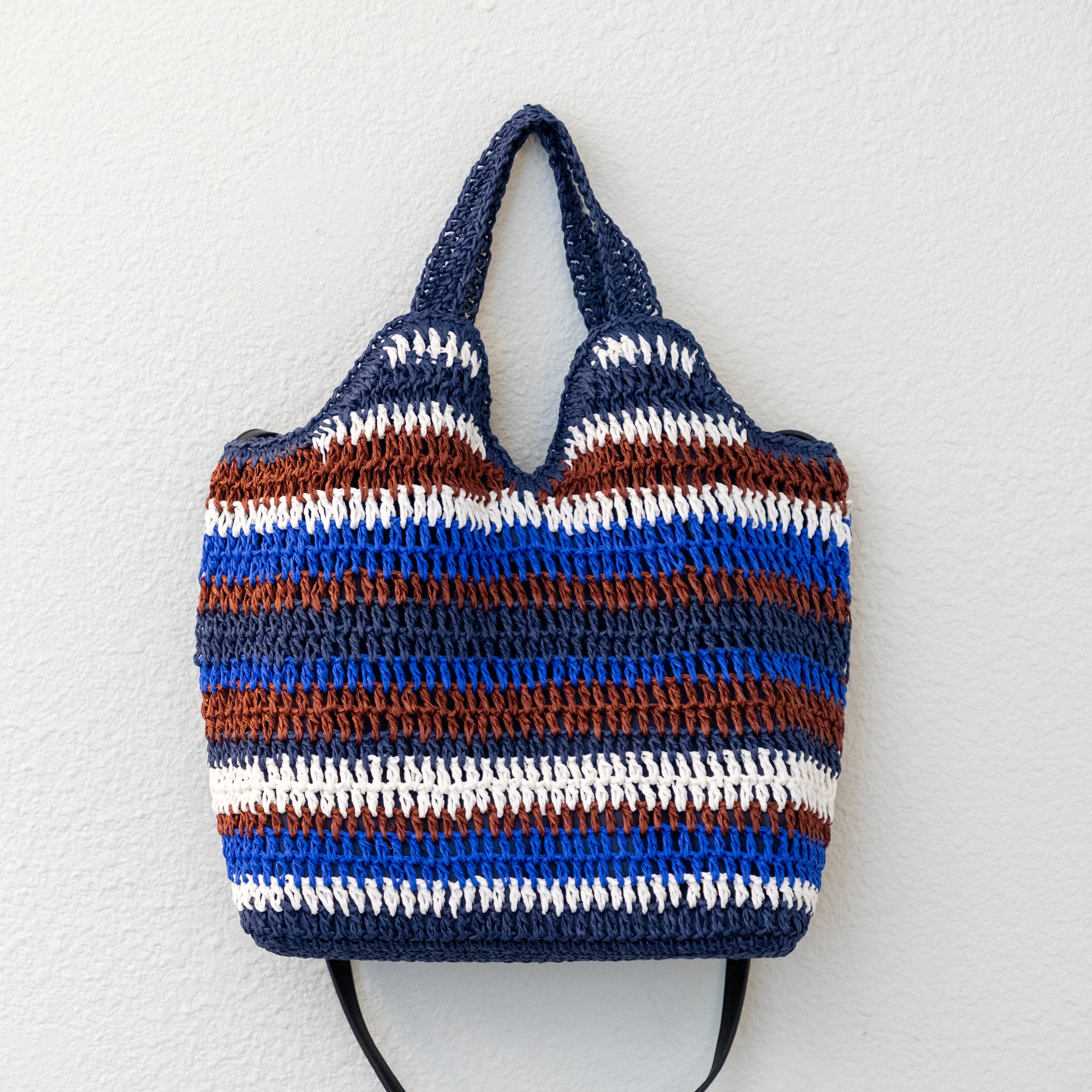 This handmade crochet straw tote bag features a bold mix of navy, brown, white, and blue stripes, creating a modern and stylish look. Lightweight yet durable, it’s perfect for everyday use—whether you're heading to the beach, the market, or a casual outing. The open-weave crochet design adds a breezy, relaxed feel, while the sturdy handles make it easy to carry. A chic and practical accessory for a laid-back, effortless style.